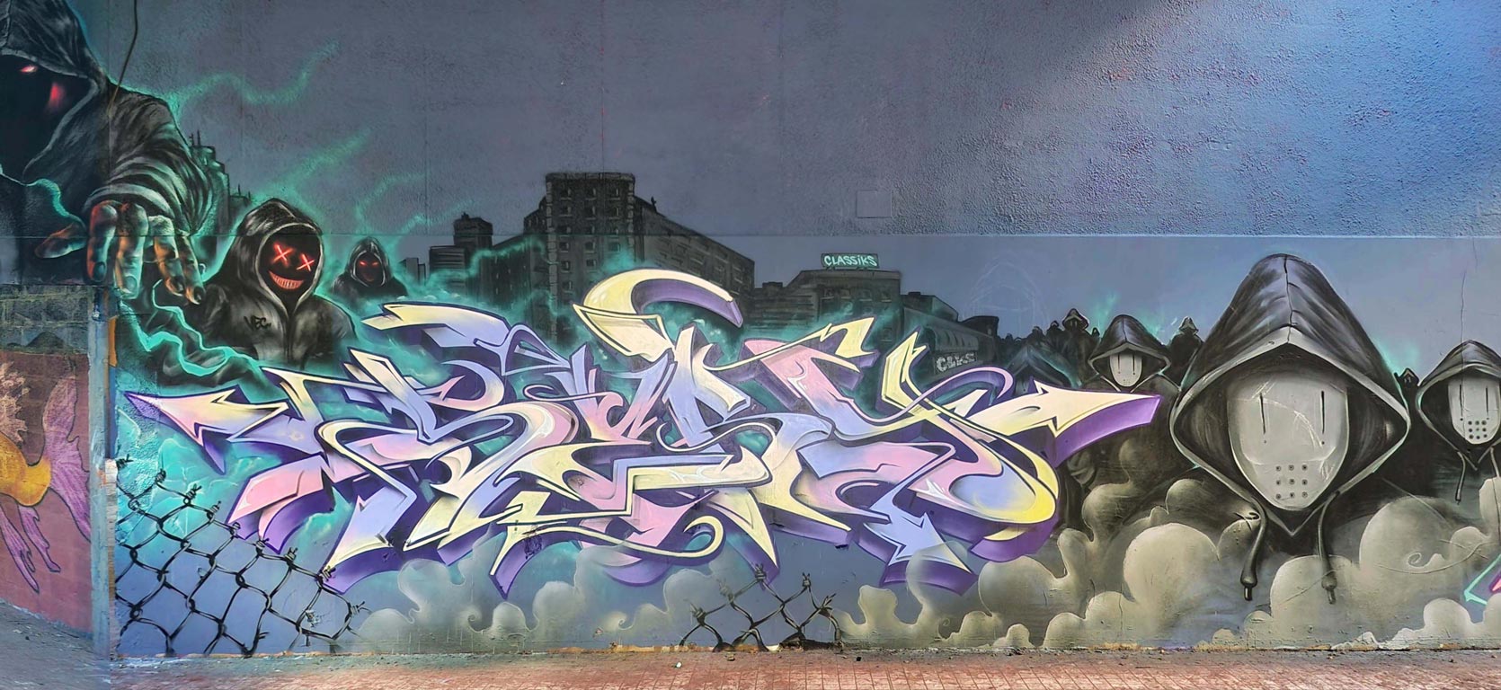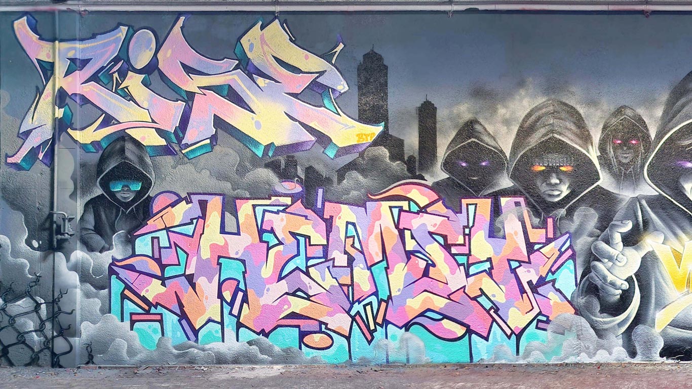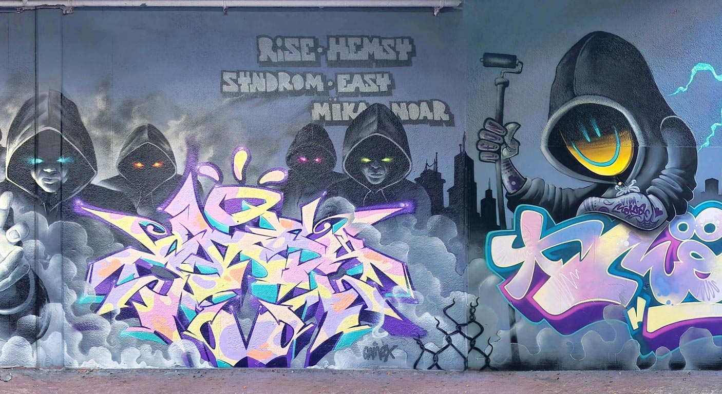 Fresque réalisée avec RISE, HEMSY, EASY, MOKA, NOAR et SERY pour le graffiti Jam de Périgueux.