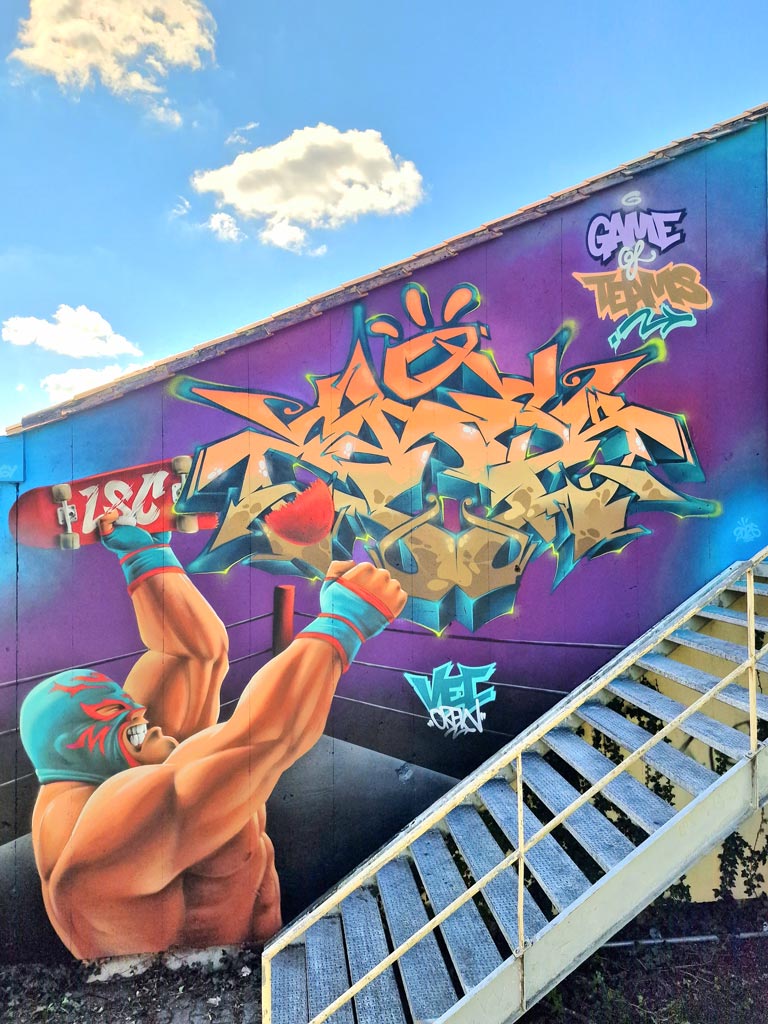 Graffiti live painting réalisé avec EASY au Skatepark de Saintes lors du contest de Skateboard organisé par l’association Movement Child.