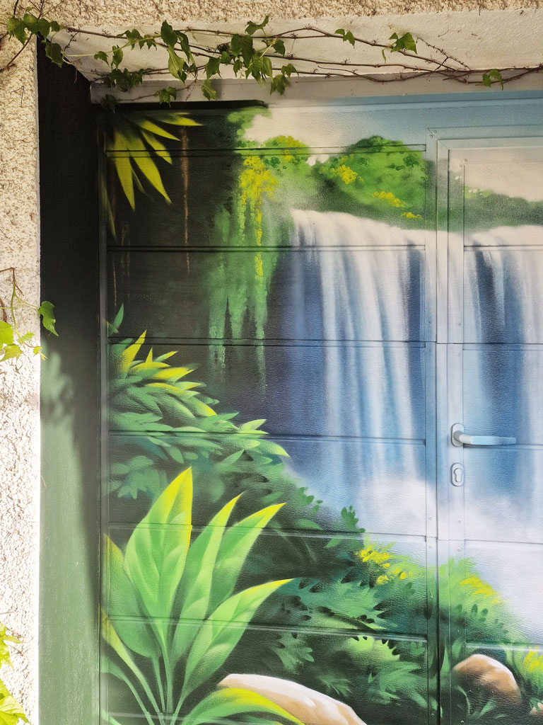 Peinture décorative sur une porte de garage thème cascade tropicale.