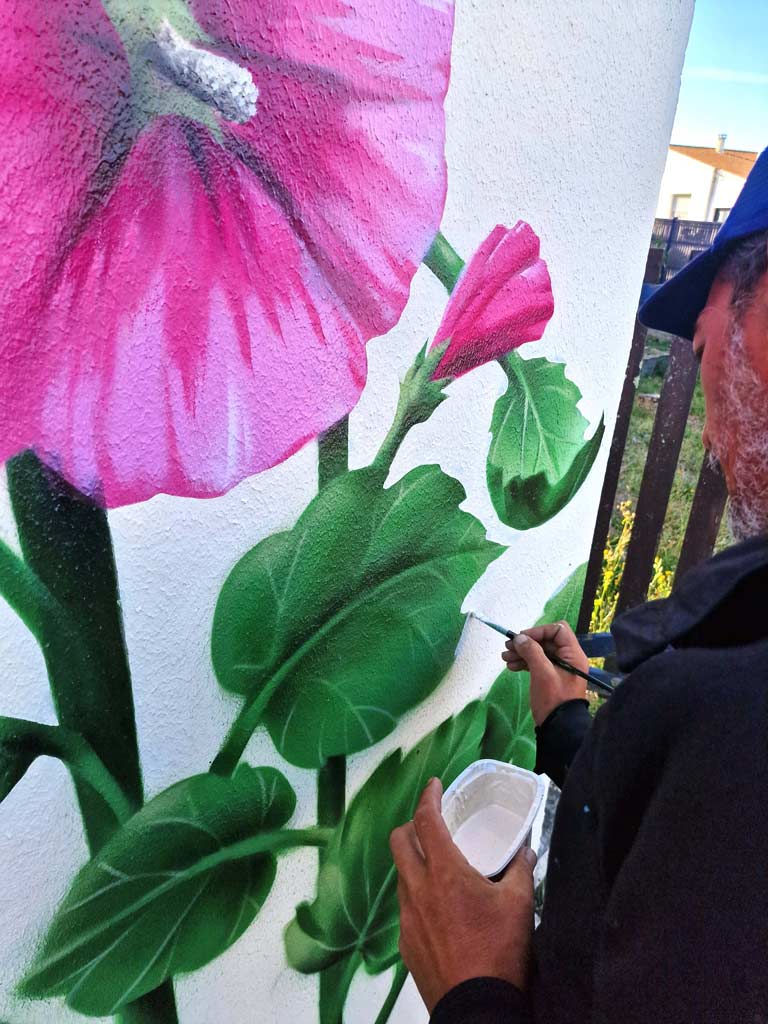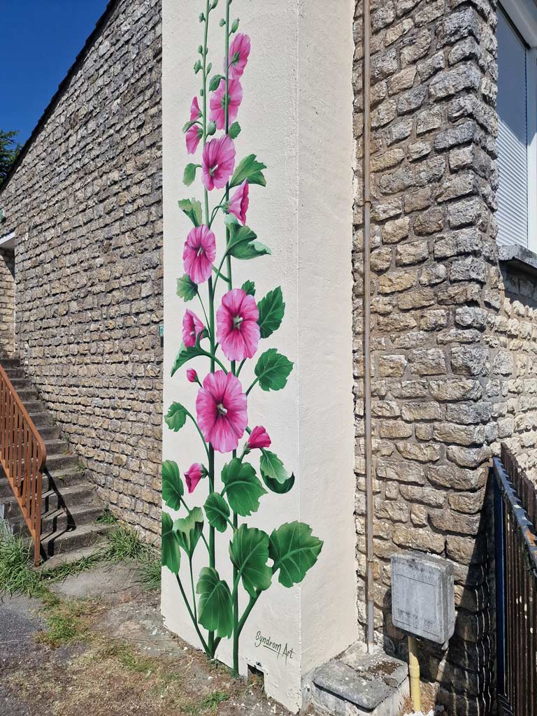 Roses Trémières pour la ville de Pons Fresque murale réalisée pour la ville de Pons. Pons (17) env. 10 m2 24h de réalisation